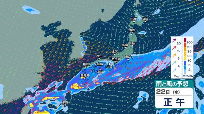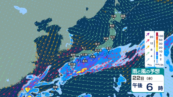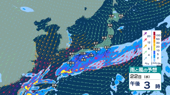 今後の雨と風のシミュレーションを見ると、きょう22日は関東甲信から沖縄まで太平洋側で雨となり、風も強まる所がありそうです。雨風はあす23日も続くところがあるでしょう。沖縄などでは24日にかけて雨の続くところがある見込みです。