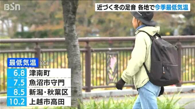 22日朝の最低気温は津南町で6.8℃、魚沼市守門で7.5℃、上越市高田で10.2℃などを記録。28の観測地点のうち19地点で10℃以下となり、26地点で今季最低となりました。