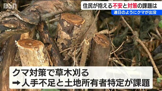 山の中がクマの居場所にならないように草木を刈っていますが、過疎化による人手不足と土地の所有者の特定が課題となっています。