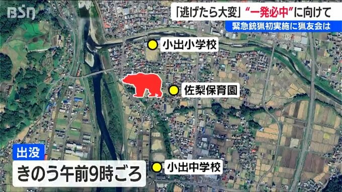クマが出没したのは21日午前9時ごろ。近くには民家もあり、小出小学校や中学校、佐梨保育園からいずれも数百メートルほどで、現場近くは通学路にもなっていました。