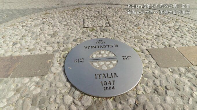 「ノヴァ・ゴリツァの駅前にはこのようなプレートが埋め込まれています。これは国境線を示しています」