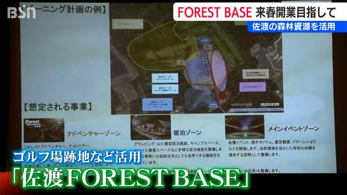 この中で発表されたのが、ゴルフ場の跡地などを再開発する『佐渡フォレストベース』の事業計画。グランピングやキャンプスペース、アスレチックに加え、災害時の避難場所としての機能も併せ持った施設で、交流人口の拡大や災害対応などにつなげたい考えです。