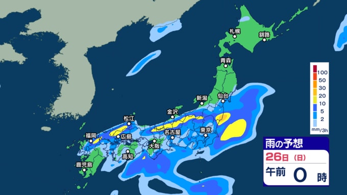 太平洋沿岸や前線、低気圧周辺では雷を伴う激しい雨の所も 西~東日本は26日にかけて 北日本では26~27日は土砂災害などに注意【3時間ごとの雨シミュレーション・25日正午更新】
