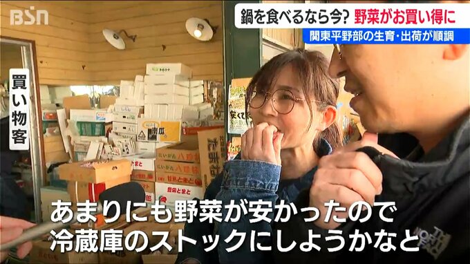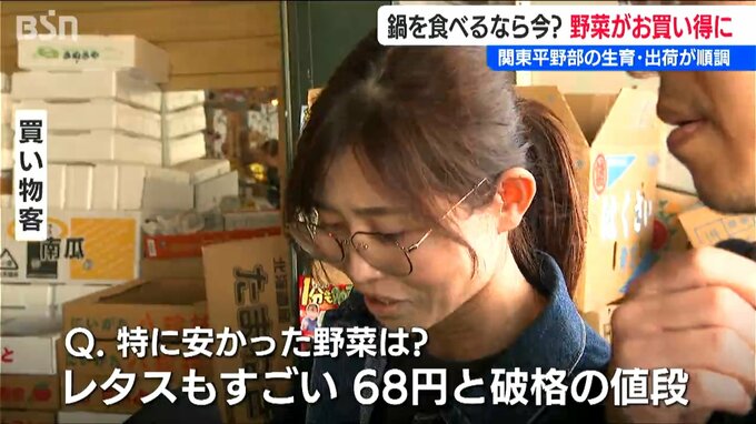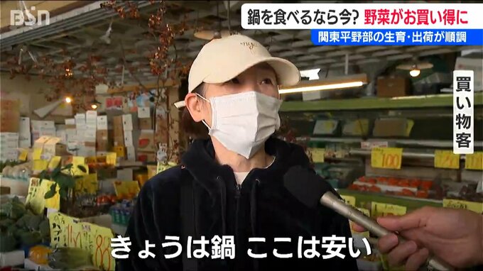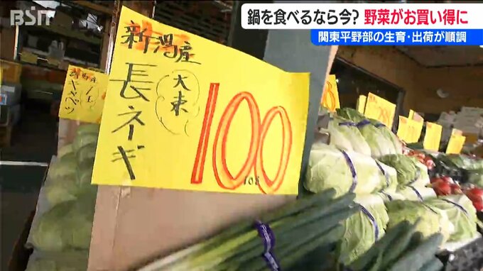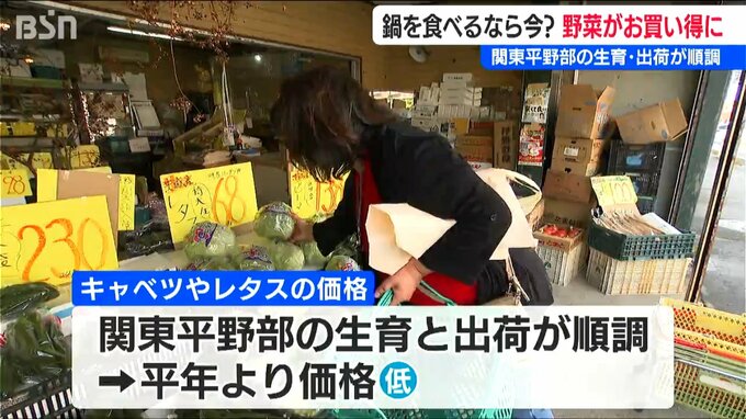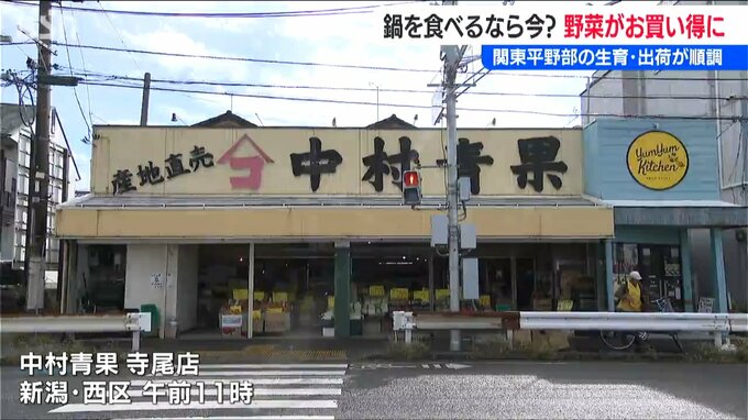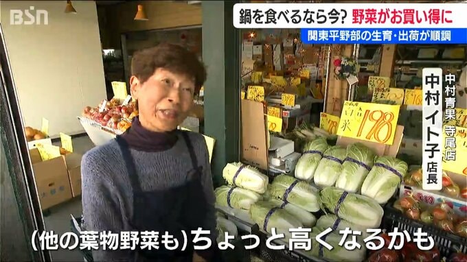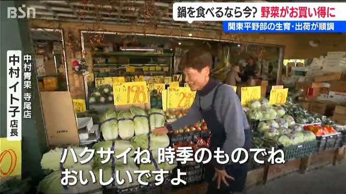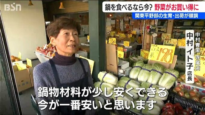 【中村青果 中村イト子 店長】「ハクサイとかネギとかキャベツが買いやすい値段なので、鍋物材料が少し安くできる。今が一番安いと思います」