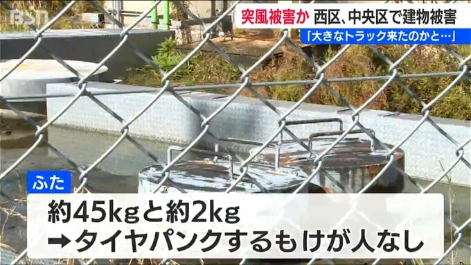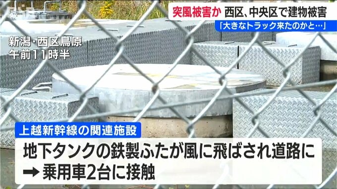 また、西区 鳥原にある上越新幹線の関連施設では地下タンクの鉄製のふたが道路に飛ばされ、乗用車2台に接触しました。