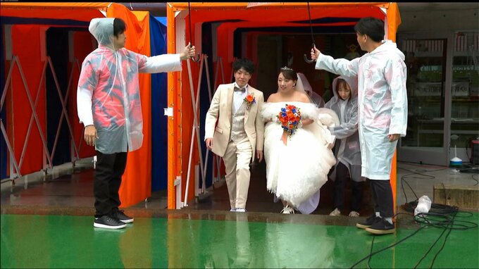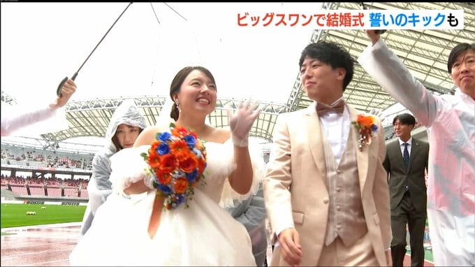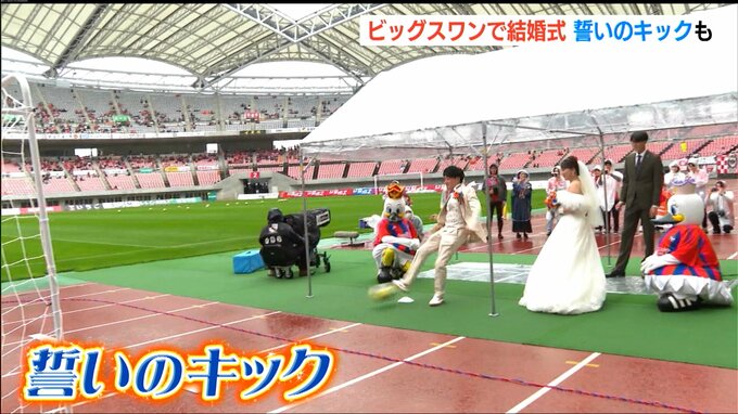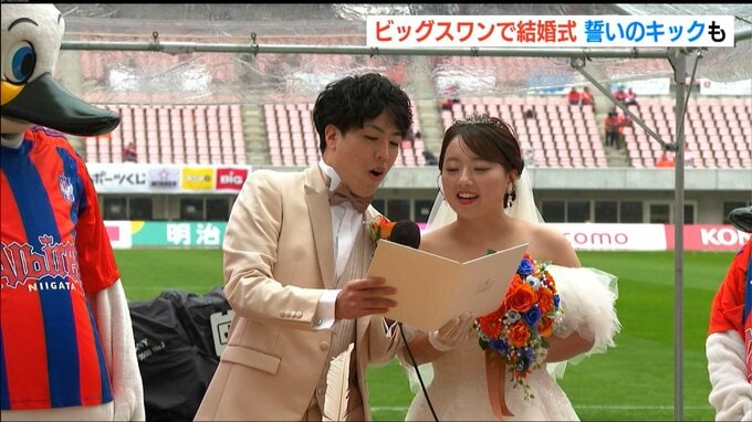 新潟市中央区の運動施設デンカビッグスワンスタジアムで26日、男子プロサッカーJ1リーグ・アルビレックス新潟対ヴィッセル神戸戦の応援に集まったサポーターたちが証人となる『人前結婚式』が行われました。