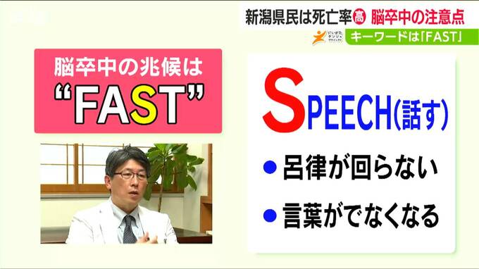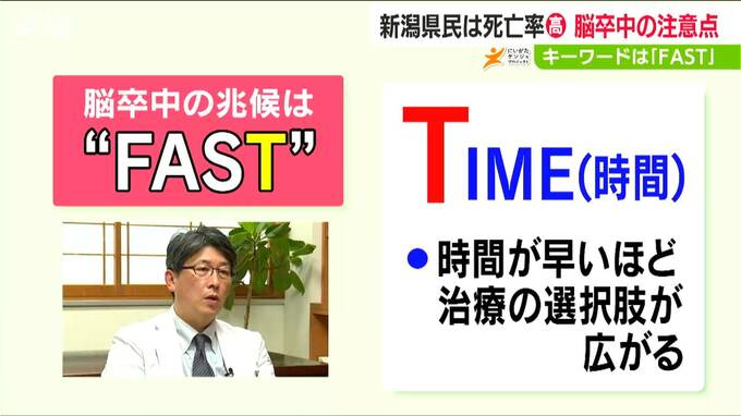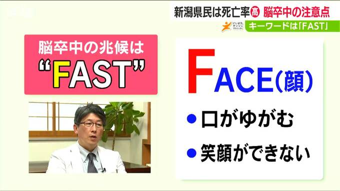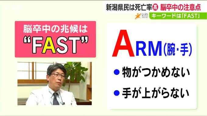 「かなり特徴的な症状が出る。その特徴の頭文字を取ってFASTという。F=FACE 顔が歪む、A=ARM 腕が上がらないなど、S=Speech 呂律が回らない、T=Time 4時間半以内に病院で対応できるかどうかが専門的な治療に進めるかの大きな分かれ道」