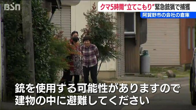 「この近くの倉庫にクマが立てこもっています。銃を使用する可能性がありますので、建物の中に避難してください」