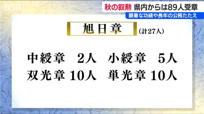 このうち、旭日中綬章は2人で、元・日本中古自動車販売協会連合会会長の海津博さん、元県議会議員の澤野修さんに贈られます。また、旭日小綬章は元・大光銀行頭取の石田幸雄さんら5人が受賞します。