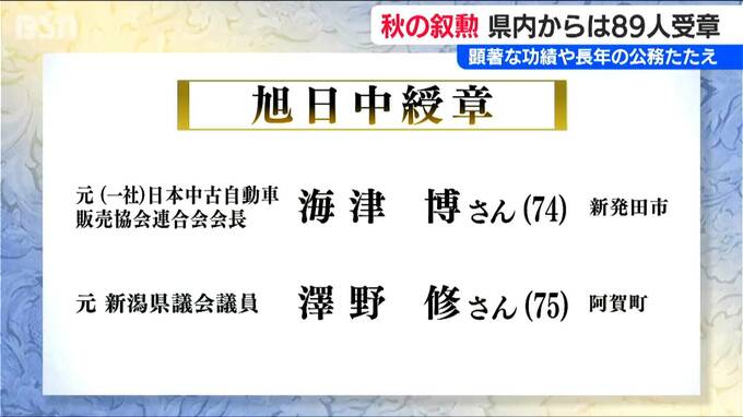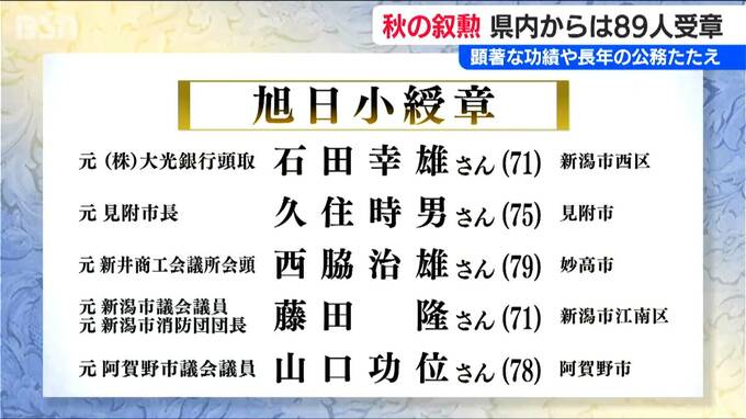 顕著な功績や長年の公務を称える秋の叙勲が発表され、新潟県内からは89人が受章します。