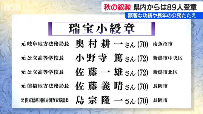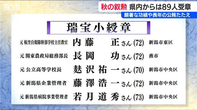 このうち、瑞宝中綬章は4人で、新潟大学名誉教授の五十嵐由利子さん、染矢源治さん、元・国立病院機構西新潟中央病院長の亀山茂樹さん、長岡技術科学大学名誉教授の矢鍋重夫さんが受賞します。