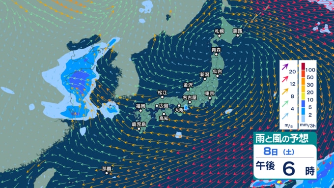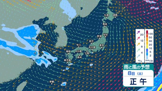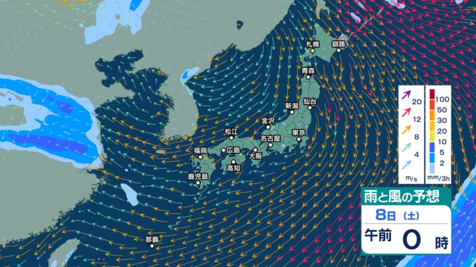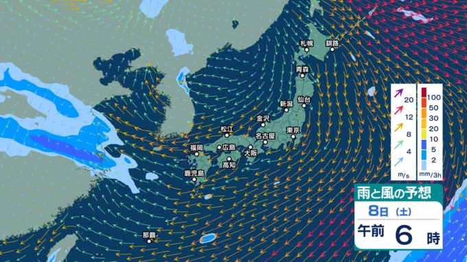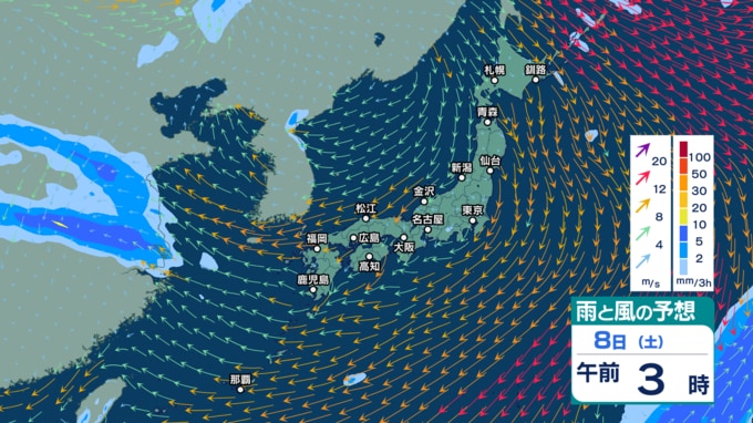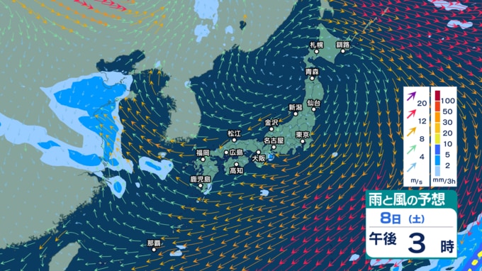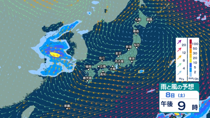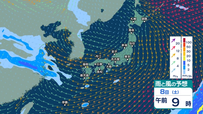 9日(日)午後3時までの雨風シミュレーション