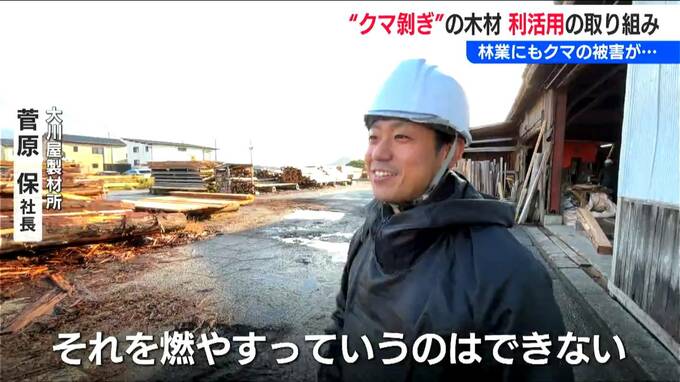クマが樹皮を剥がす『クマ剥ぎ』の被害を受けた木は、製材品として利用することは難しいと、大川屋製材所の菅原保社長は話します。