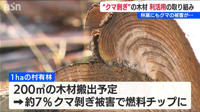 関川村森林組合によりますと、村内のある集落では1ヘクタールの村有林から200立方メートルの木材を搬出する計画でしたが、そのうちのおよそ7%はクマ剥ぎの被害を受けたために燃料チップにせざるを得ませんでした。