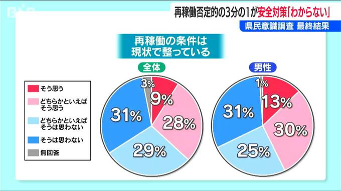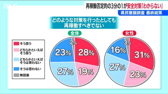 それによりますと、再稼働の条件が整っていないという声が大きく、再稼働に否定的な回答をした人の3分の1が“安全対策”などについて「わからない」と回答していたということです。