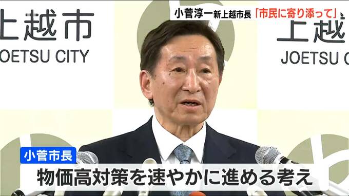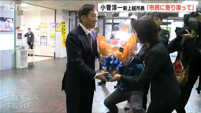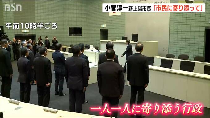 上越市長選で初当選した小菅淳一 新市長が10日、初登庁し「市民一人ひとりに寄り添ってほしい」と職員に訓示しました。