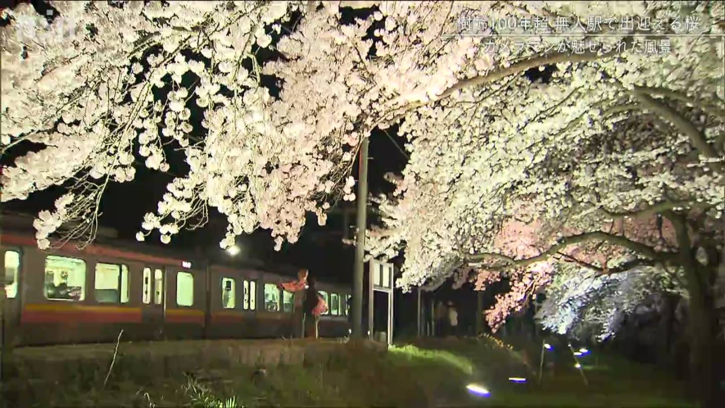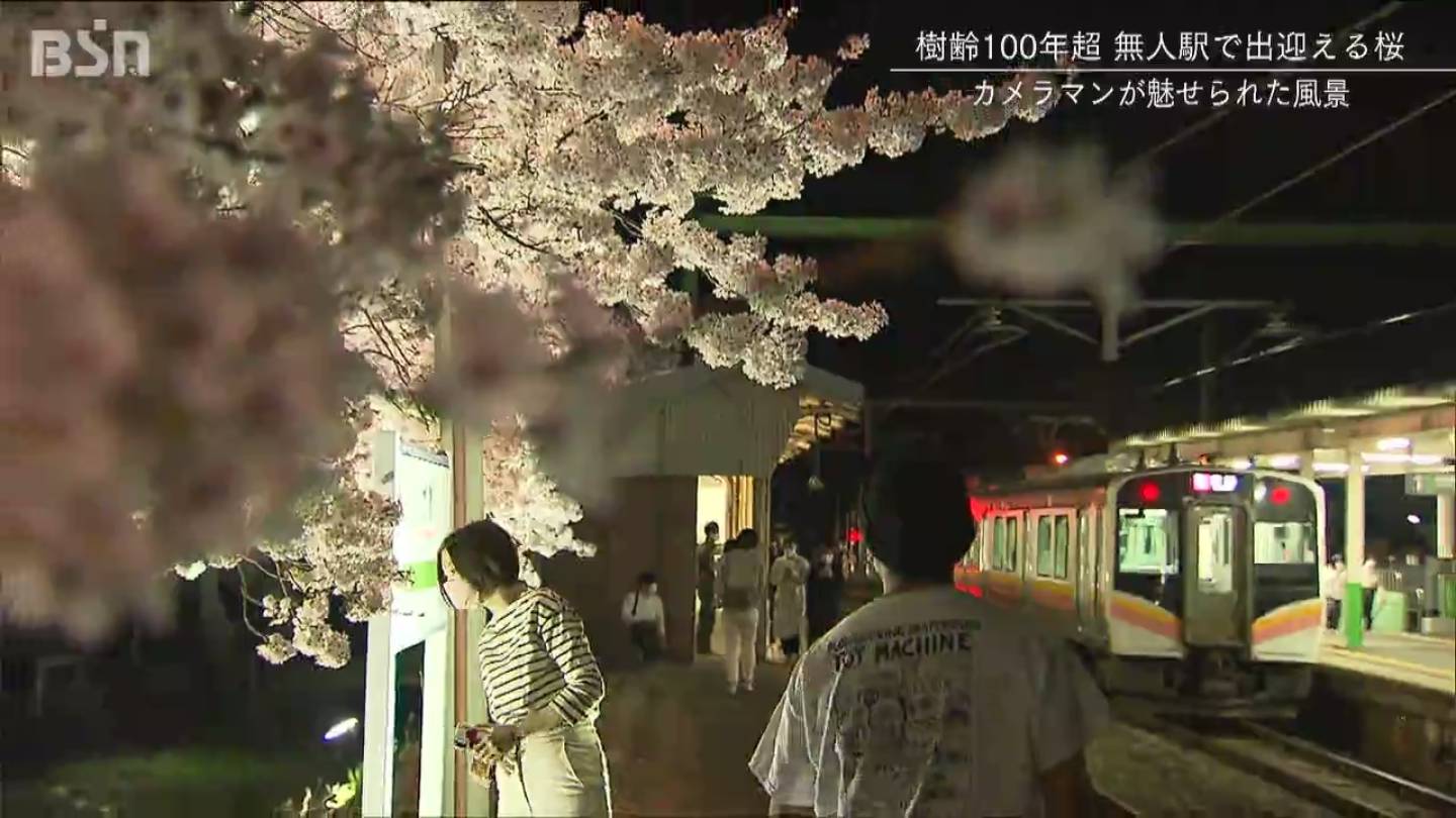 夕暮れ時、分水駅の桜はまた違った表情を見せます。