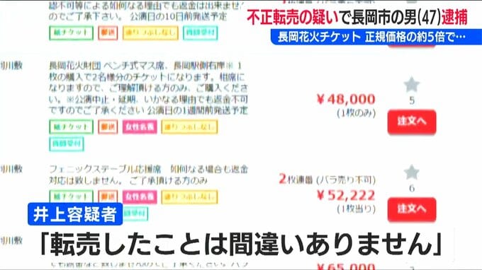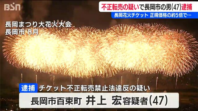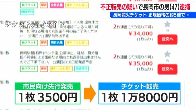 長岡花火のチケット転売を巡り新潟県で内初の逮捕者です。今年の長岡大花火大会の3500円のチケットを1万8000円で転売したとして長岡市に住む47歳の男が逮捕されました。