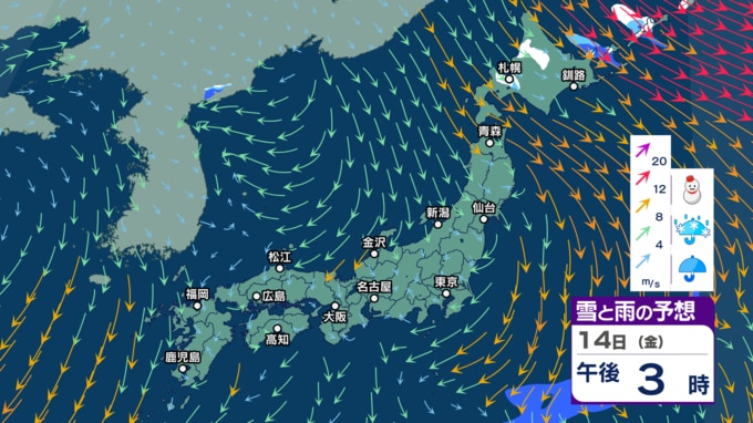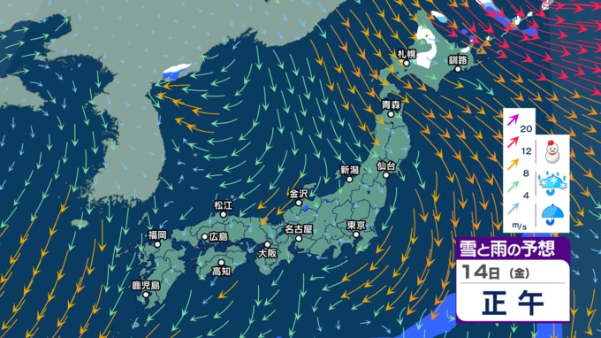 土日は晴れる所も週明けは北日本を中心に荒れた天気か 強い寒気が流れ込み日本海側では山沿いを中心に雪に【3時間ごとの雨シミュレーション・14日正午更新】