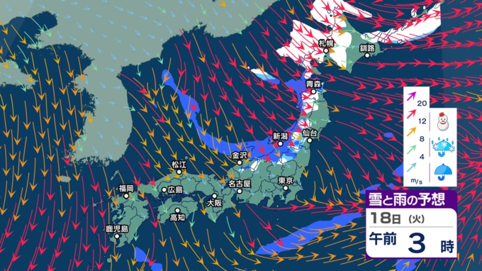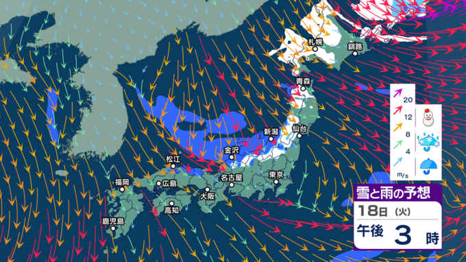 3. あす17日は北日本で大荒れの天気か その後は19日にかけて日本海側で大雨や大雪に? 中国地方でも山地を中心に雪が降り積雪の可能性も【3時間ごとの雨雪と風のシミュレーション・16日午後9時更新】