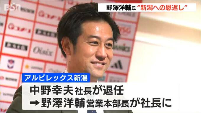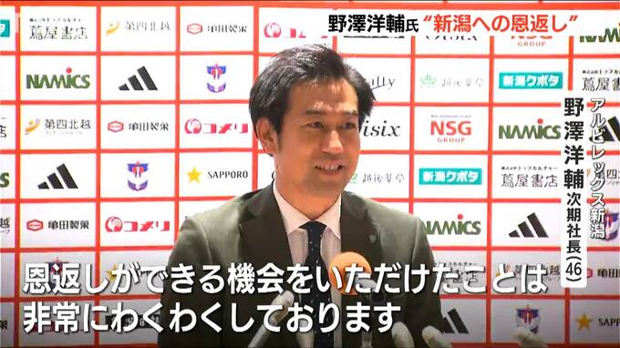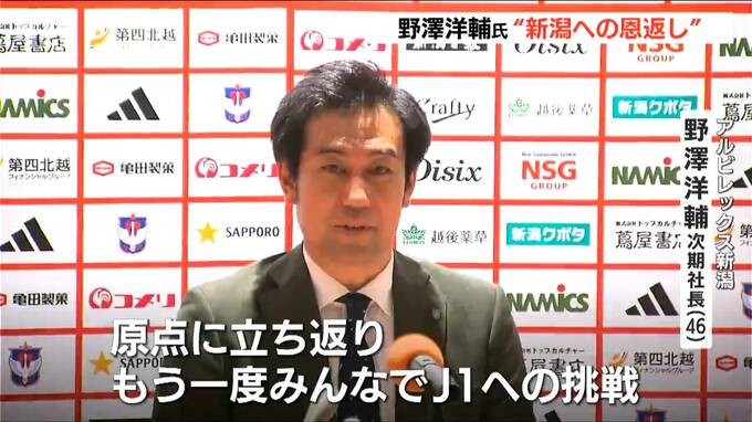 アルビレックス新潟の次期社長に決まった元ゴールキーパーの野澤洋輔氏が、「新潟への恩返し」とともに「もう一度J1へ挑戦」と意気込みを語りました。