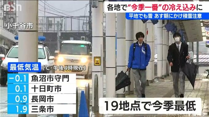 県内では一日を通してどんどん気温が下がり、午4時現在、魚沼市 守門でマイナス0.1℃、長岡市で0.9℃の最低気温を観測するなど、28の観測点のうち19地点で今季最低気温となりました。