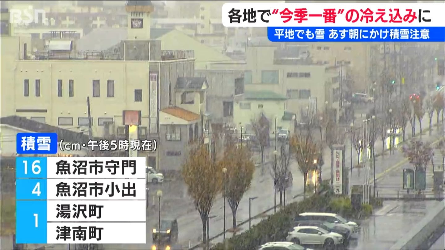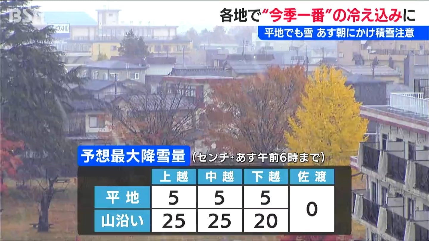 県内では一日を通してどんどん気温が下がり、午4時現在、魚沼市 守門でマイナス0.1℃、長岡市で0.9℃の最低気温を観測するなど、28の観測点のうち19地点で今季最低気温となりました。