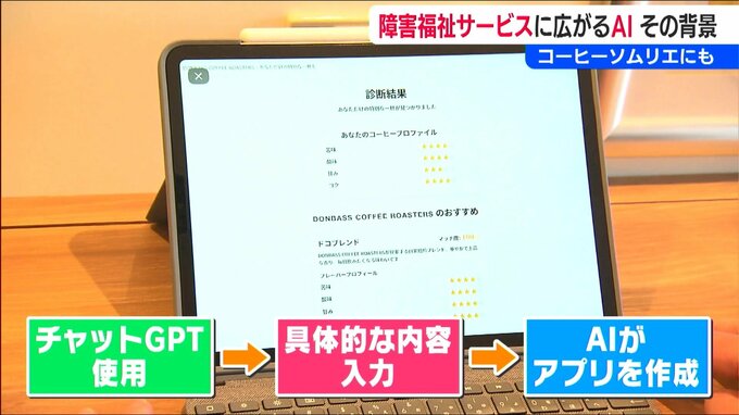 「コーヒーを診断できるようなアプリをつくりたいです」という問いかけをすると、AIがその内容通りのアプリを作成。改良を重ねて1か月で完成した『コーヒーアプリ』は、障害のあるスタッフの“お守り代わり”になっています。