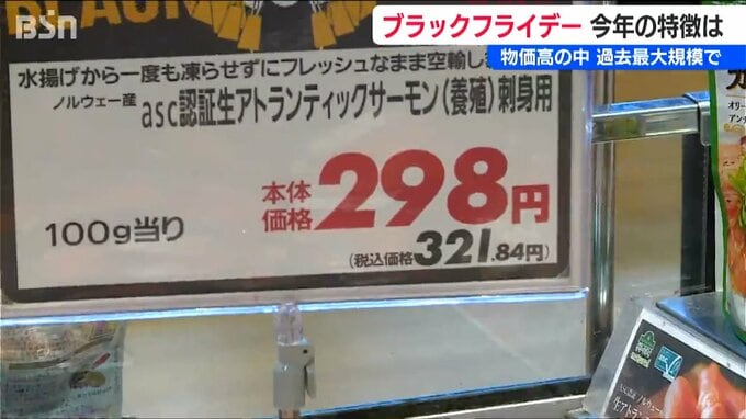 【記者リポート】「食品売り場では550品目以上がブラックフライデーの対象です。中でもメインがこちら、アトランティックサーモン、通常100g 598円がなんと298円です」
