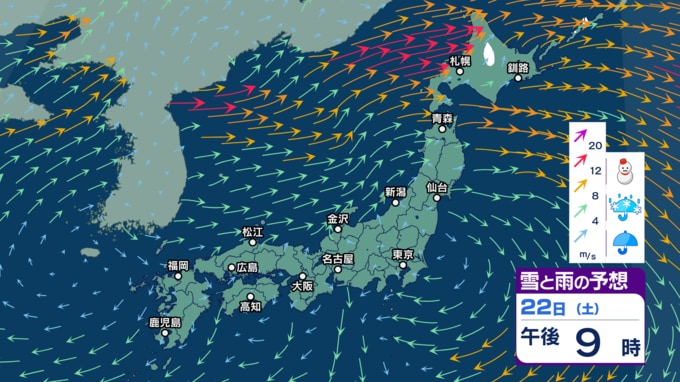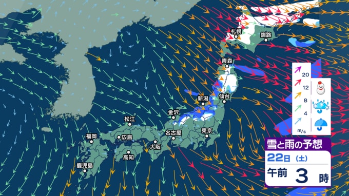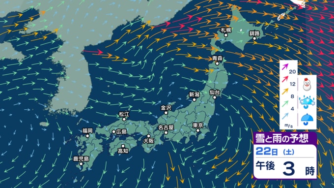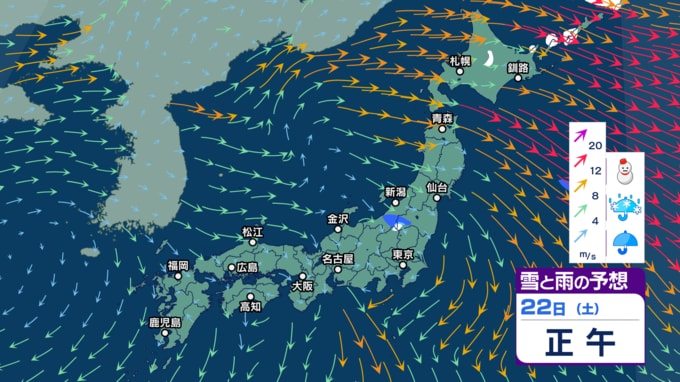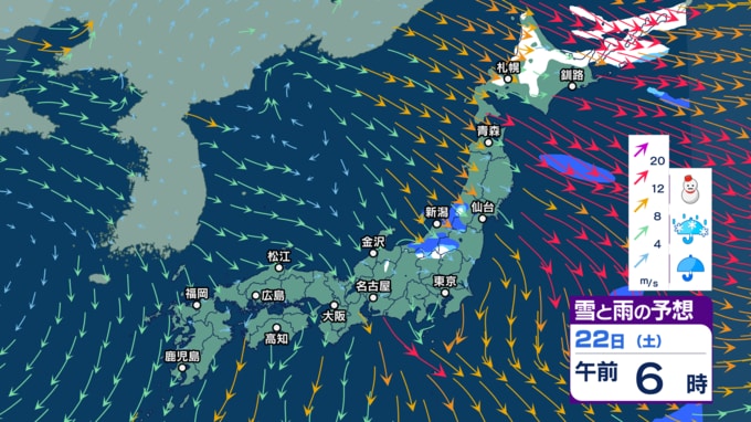 大気の状態が非常に不安定で北日本~東日本で大雨となる所も 土砂災害に注意・警戒 25~26日は大荒れの恐れも?【3時間ごとの雨雪と風のシミュレーション・21日正午更新】 2025年11月21日(金) 12:00 22日(土)の雨雪と風のシミュレーション