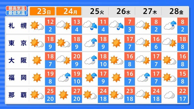 3連休の中日となる23日も、朝から晴れる所が多くなりそうです。ただ、北日本の日本海側では雨となる時間帯もある見込みです。