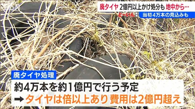 市によりますと、1億円ほどを予算として見込んでいましたが、廃タイヤは4万本の倍以上あり、処理や周辺の工事などで費用は、すでに2億円以上かかっているということです。
