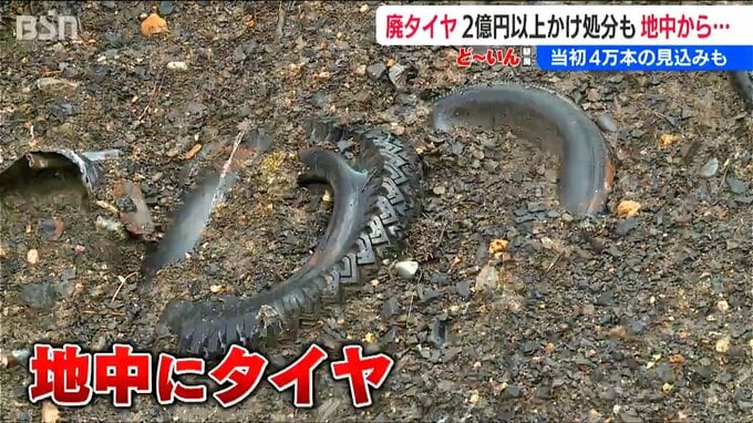 山積みの廃タイヤを処理したところ、地面に埋まっていたタイヤを発見。そこで市が土地の一部を重機で掘ったところ…。