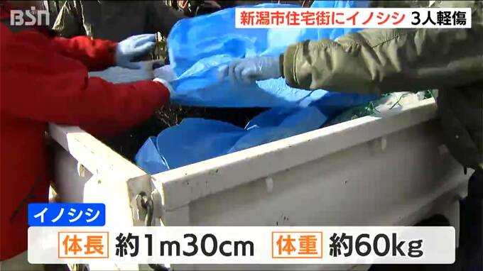 新潟市江南区や秋葉区の住宅街で29日午前、イノシシが出没し、1頭が駆除されました。体当たりされたり、転倒したりして3人がけがをしたほか、車数台に被害がありました。