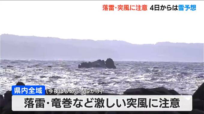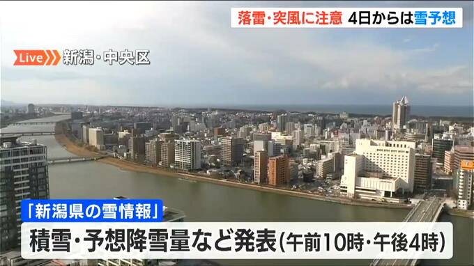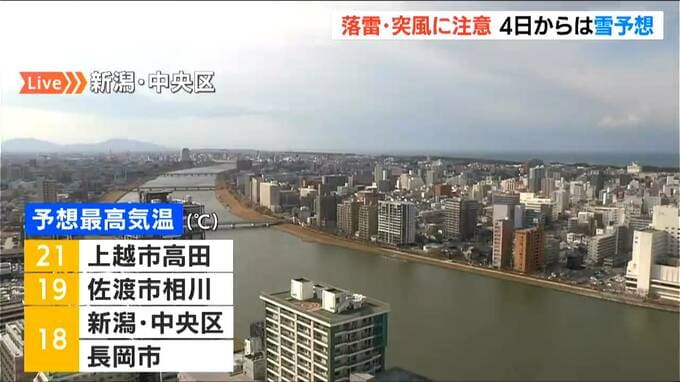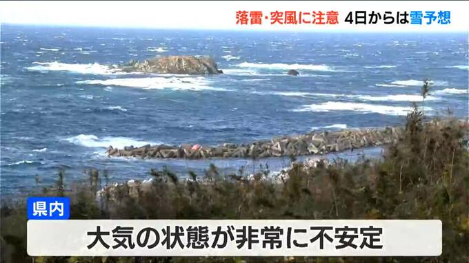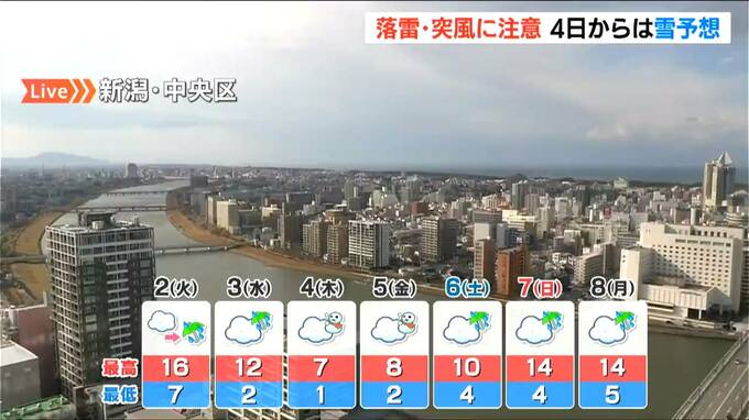 新潟県内は大気の状態が非常に不安定となり、1日の夜はじめごろにかけて、落雷や竜巻などの激しい突風に注意が必要です。また、3日からは冬型の気圧配置が強まり、平地でも雪となる所がありそうです。