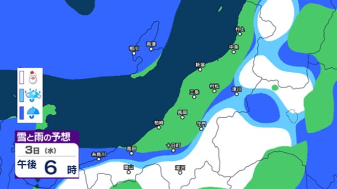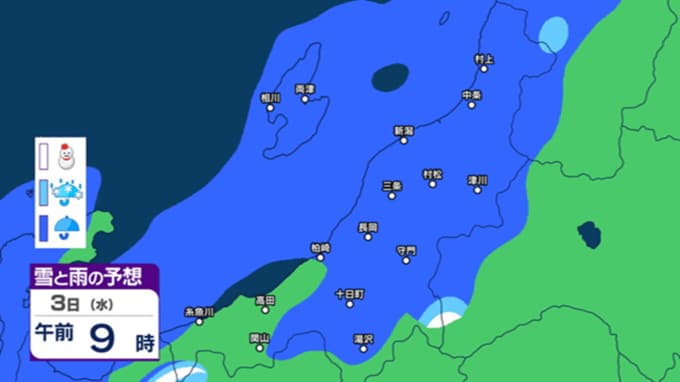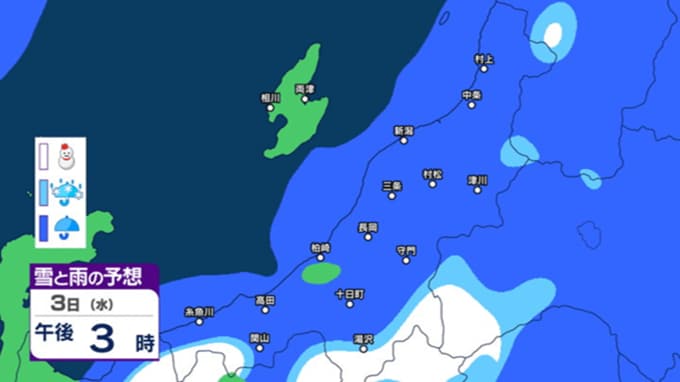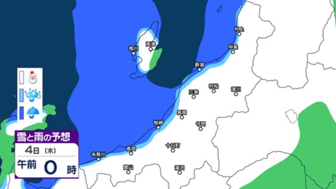その後、午後6時には下越の山沿いでも降り始め、4日の未明には上越市高田・長岡・新潟市の一部など、県内の平地でも雪が降ると予想されています。