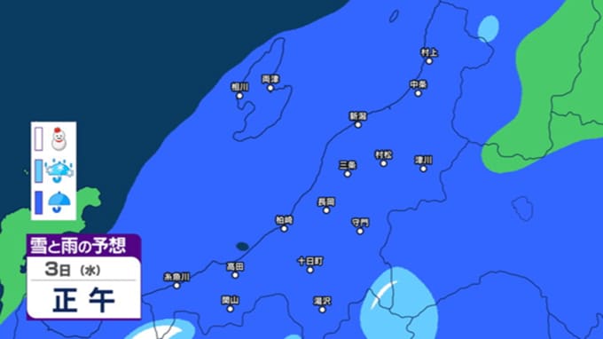 正午までは県内全域で雨が降る予想ですが、午後になると湯沢など中越や上越の山沿いで雪が降り始める見込みです。