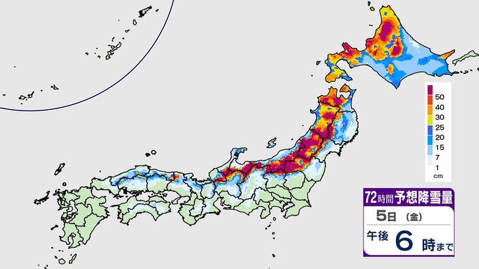 北海道から山陰まで日本海側を中心に雪となり、東海などでも雪となる所がある見込みです。また、東北や関東北部、長野県、新潟県では山沿いを中心に大雪となる所もありそうです。上空の寒気が予想以上に強まった場合などは警報級の大雪となる恐れもあるとしています。