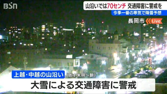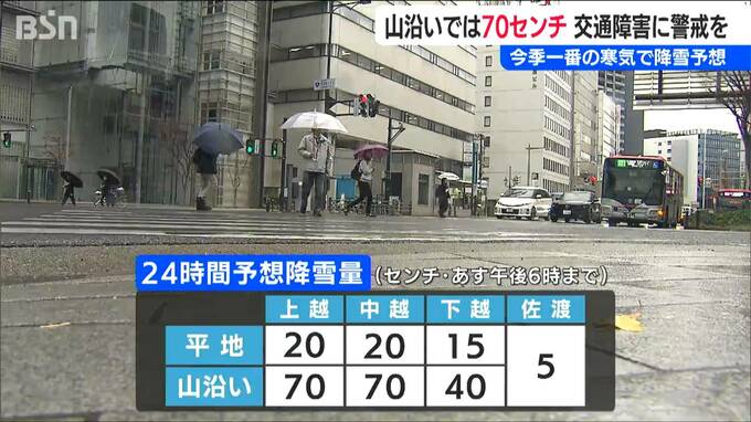 4日夕方までの24時間に予想される雪の量は、いずれも多いところで、山沿いが上・中越で70cm、下越で40cm、平地が上・中越で20cm、下越で15cmとなっています。