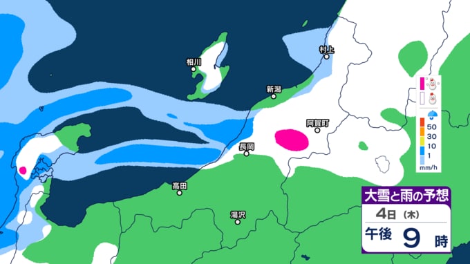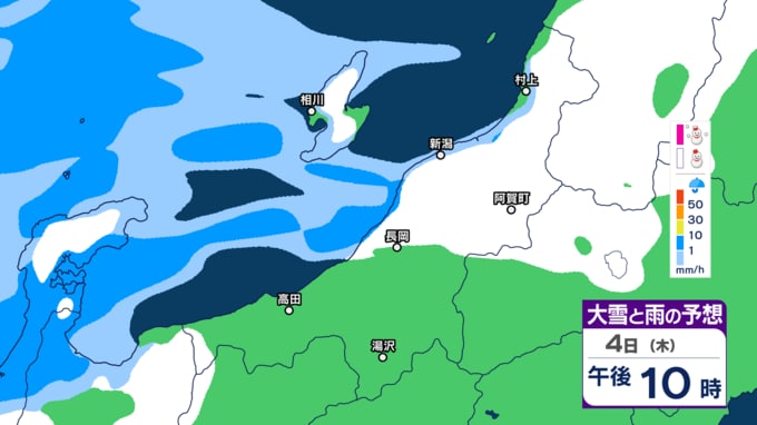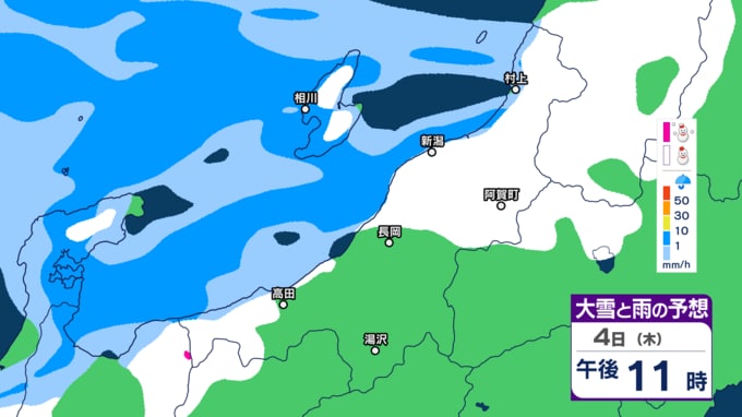 あすの雪は“いつどこで”降る?【今後の大雪と雨のシミュレーション・4日午後7時30分更新】新潟県 2025年12月4日(木) 18:56 国内 天気 4日夜の『大雪と雨の予想図』(1時間ごとのシミュレーション)