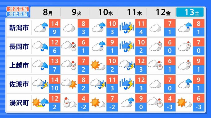 また、10日(水)は下越を中心に雨となる所があるほか、11日(木)は広い範囲で雨となり、標高の高い所では雪となりそうです。