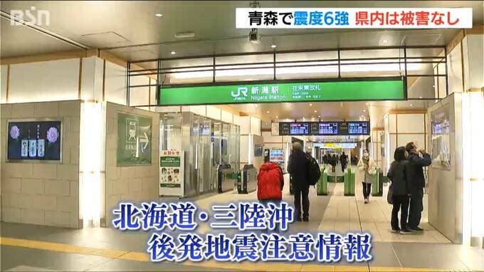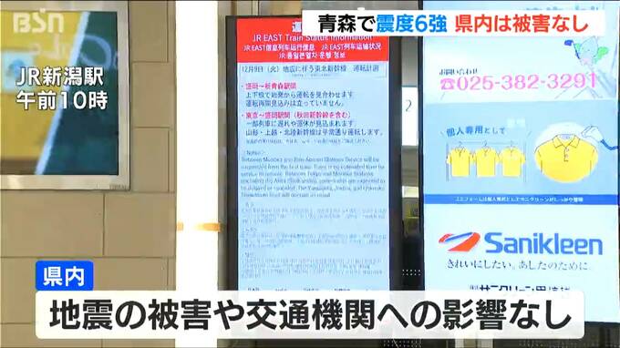 青森県で震度6強を観測した8日夜の地震で新潟県内では最大震度3を観測しましたが、被害や交通機関への影響などはありませんでした。