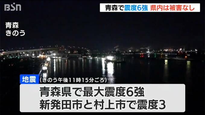 8日午後11時15分ごろ、青森県で最大震度6強を観測した地震では、新発田市と村上市で震度3の揺れを観測しました。