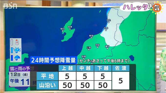 11日夜からの24時間に予想される降雪量は、上・中・下越の山沿いで最大50cm、上・中・下越の平地と佐渡で5cmと予想されています。