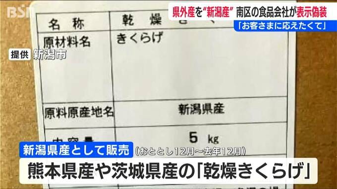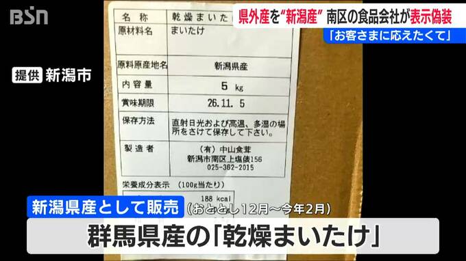 キノコ類の栽培や販売をする新潟市南区の会社が、新潟県外産のシイタケなどを新潟県産と偽って販売していたと、新潟市が10日に発表しました。