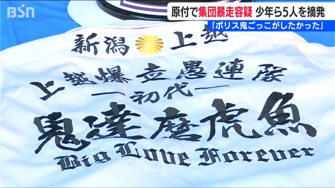 警察が押収した特攻服には『直江津』や『特攻隊長』と記され、背中には『鬼達磨虎魚』の5文字。