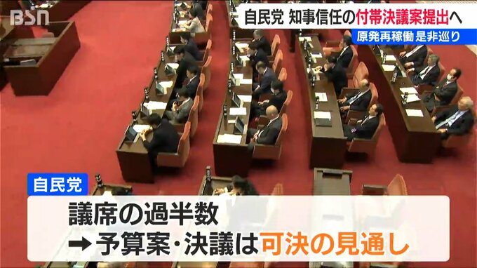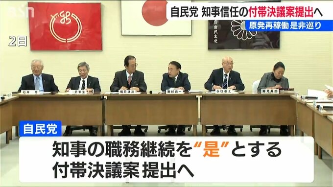 12月議会での各党会派の動向が注目されるなか、最大会派の自民党が、再稼働に関する補正予算案に賛成したうえで、知事が職務を続けることを“是”とする趣旨の『付帯決議案』を提出する方針を固めたことが関係者への取材でわかりました。