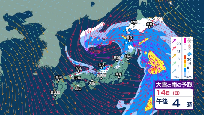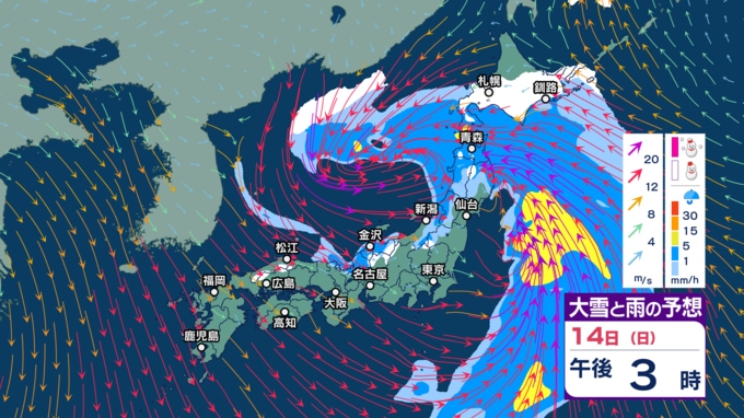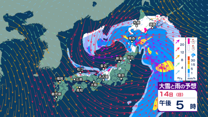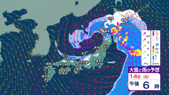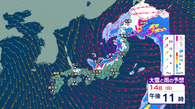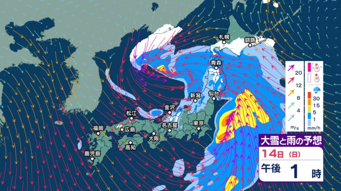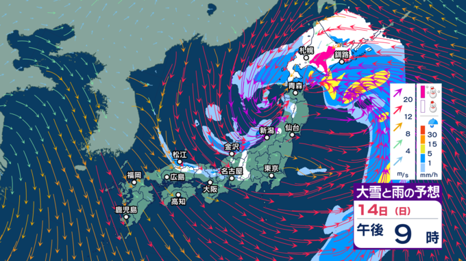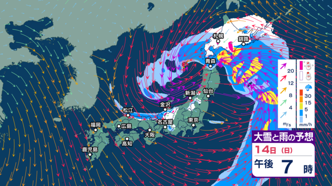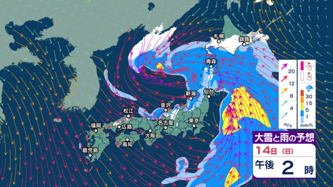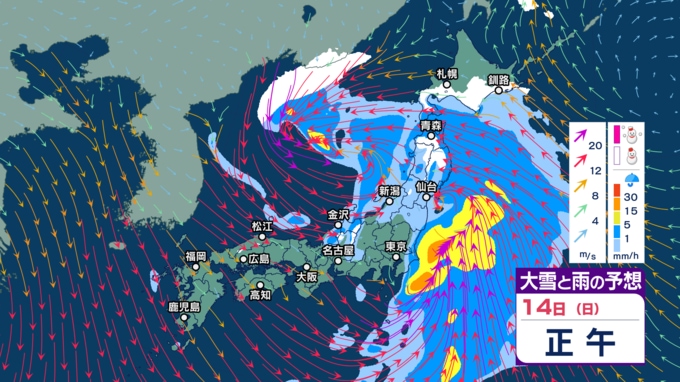 【暴風や暴風雪・高波警戒】北日本や北陸では15日にかけて大荒れか 北海道では大雪による交通障害に警戒し高潮に厳重警戒【今後の雨・雪と風のシミュレーション(1時間ごと)・14日正午更新】 2025年12月14日(日) 12:00 14日(日)正午~午後11時の雨・雪と風のシミュレーション(1時間ごと)