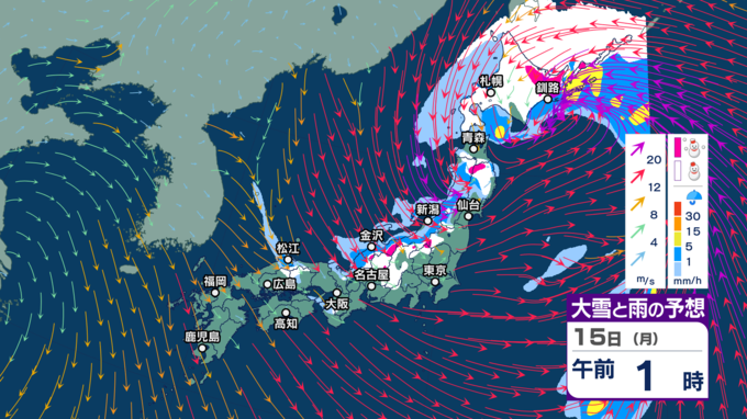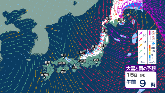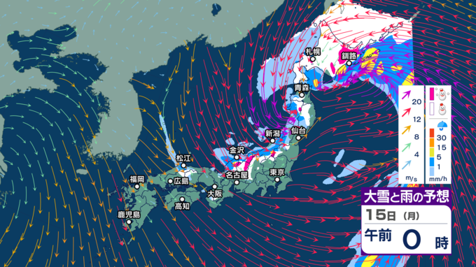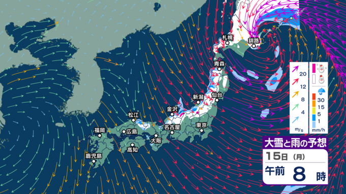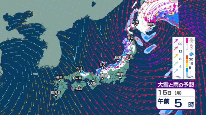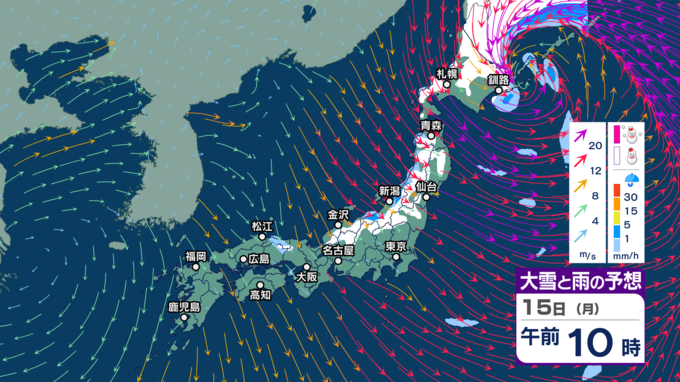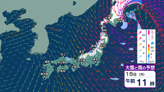 【暴風や暴風雪・高波警戒】北日本や北陸では15日にかけて大荒れか 北海道では大雪による交通障害に警戒し高潮に厳重警戒【今後の雨・雪と風のシミュレーション(1時間ごと)・14日正午更新】 2025年12月14日(日) 12:00 15日(月)午前0時~11時の雨・雪と風のシミュレーション(1時間ごと)