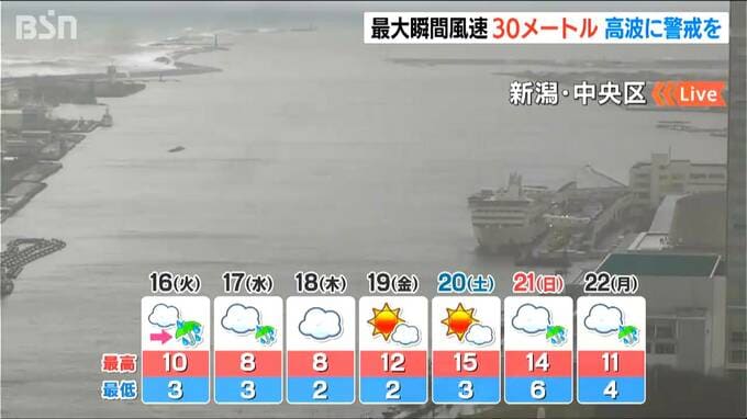 新潟県内は14日夜から強風が吹き荒れ、佐渡市では最大瞬間風速30メートルを観測しました。強風のピークは過ぎたものの、下越と佐渡では、昼過ぎにかけて高波に警戒してください。